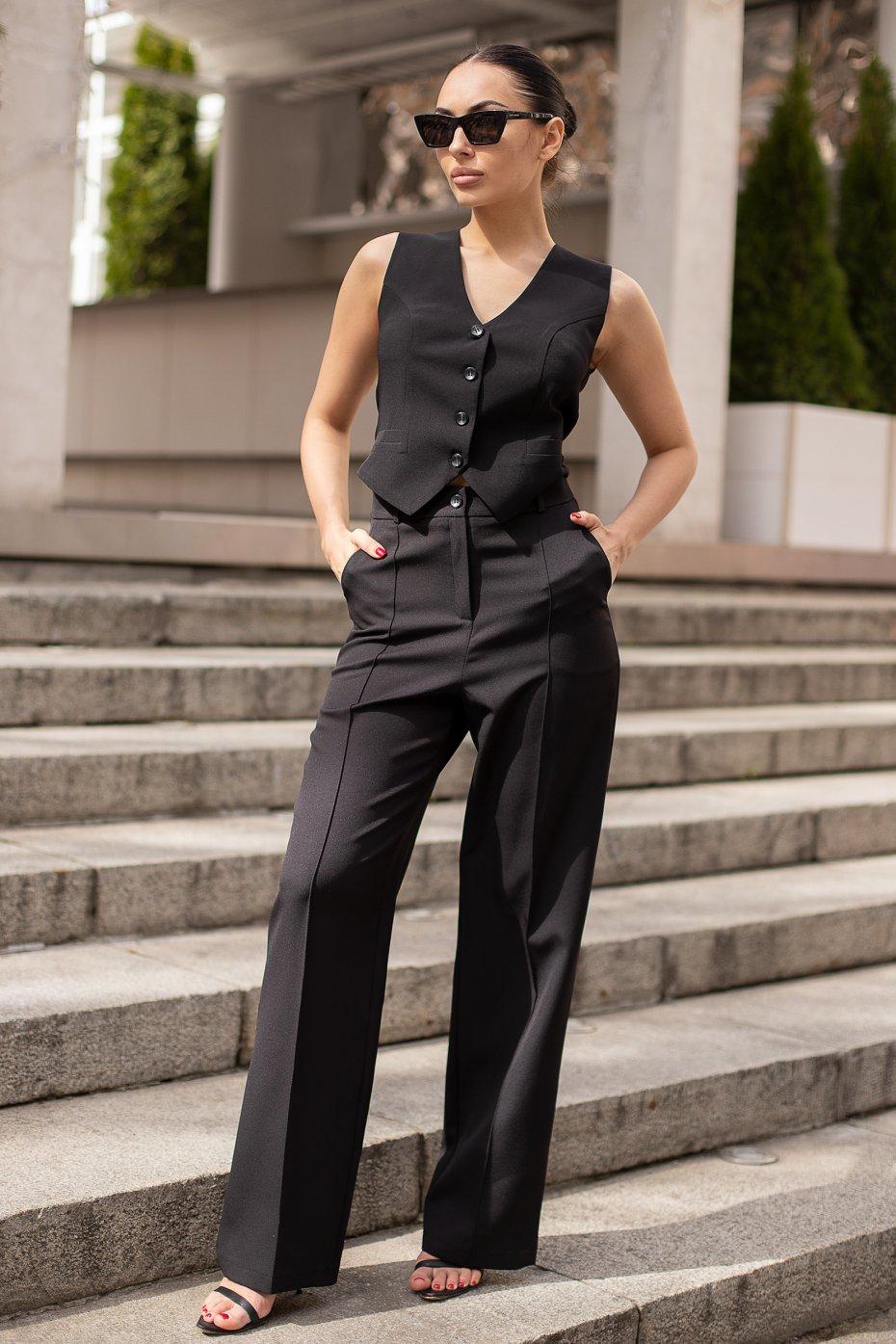Трендовий костюм-двійка. Верх - коротка жилетка напівприталеного силуету. На полицях збоку декоративні листочки. Горловина з V-подібним вирізом. Застібка спереду на петлі та ґудзики. Довжина виробу по центру спинки 38 см. Низ - прямі штани вільного крою з високою посадкою по талії. Кишені збоку та шльовки на поясі для ременя. Відмінною особливістю даних штанів є виразні стрілки, які гарно сідають на фігуру і візуально витягують силует. Довжина по боковому шву 113 см, по кроковому 82 см.